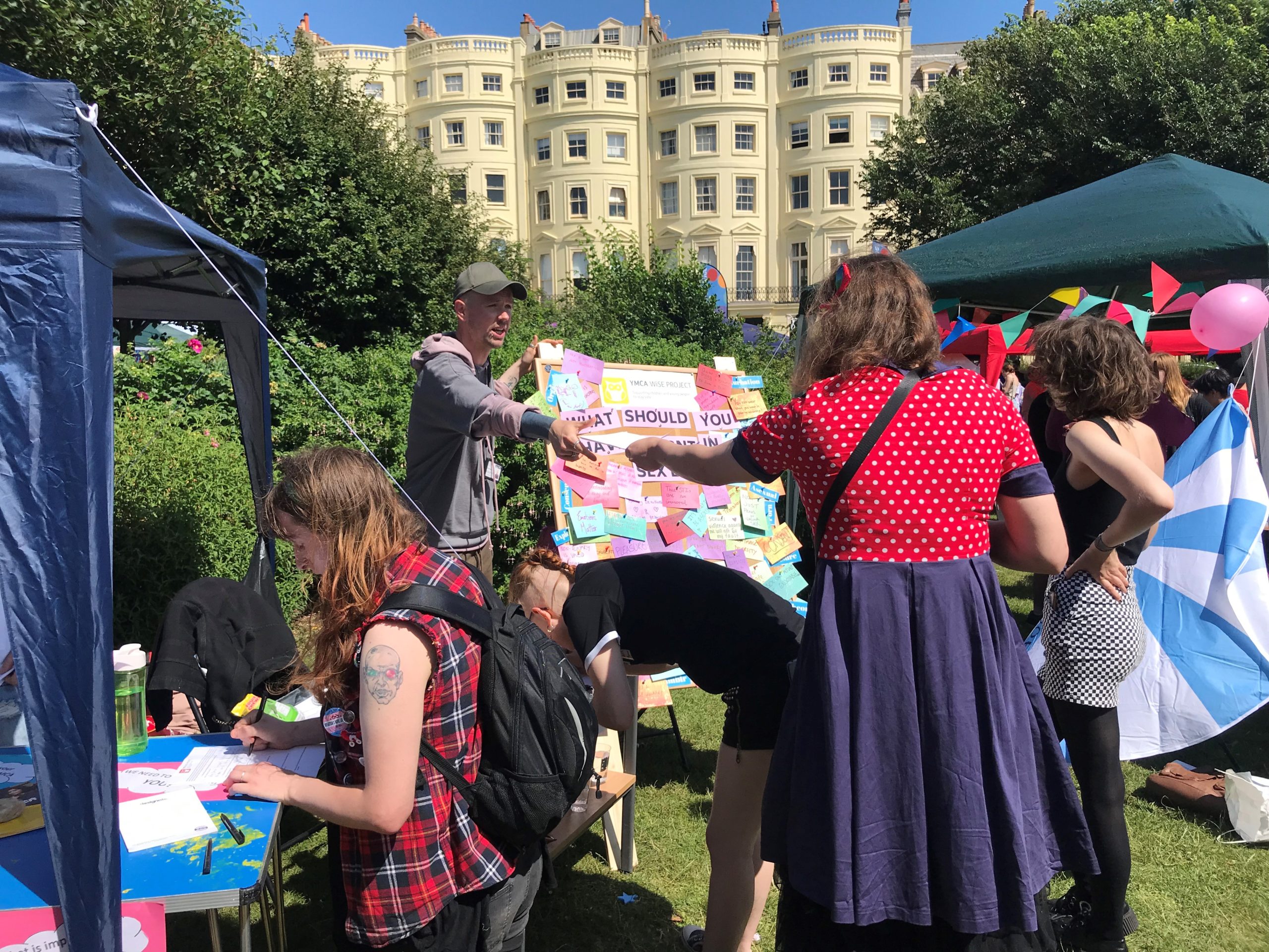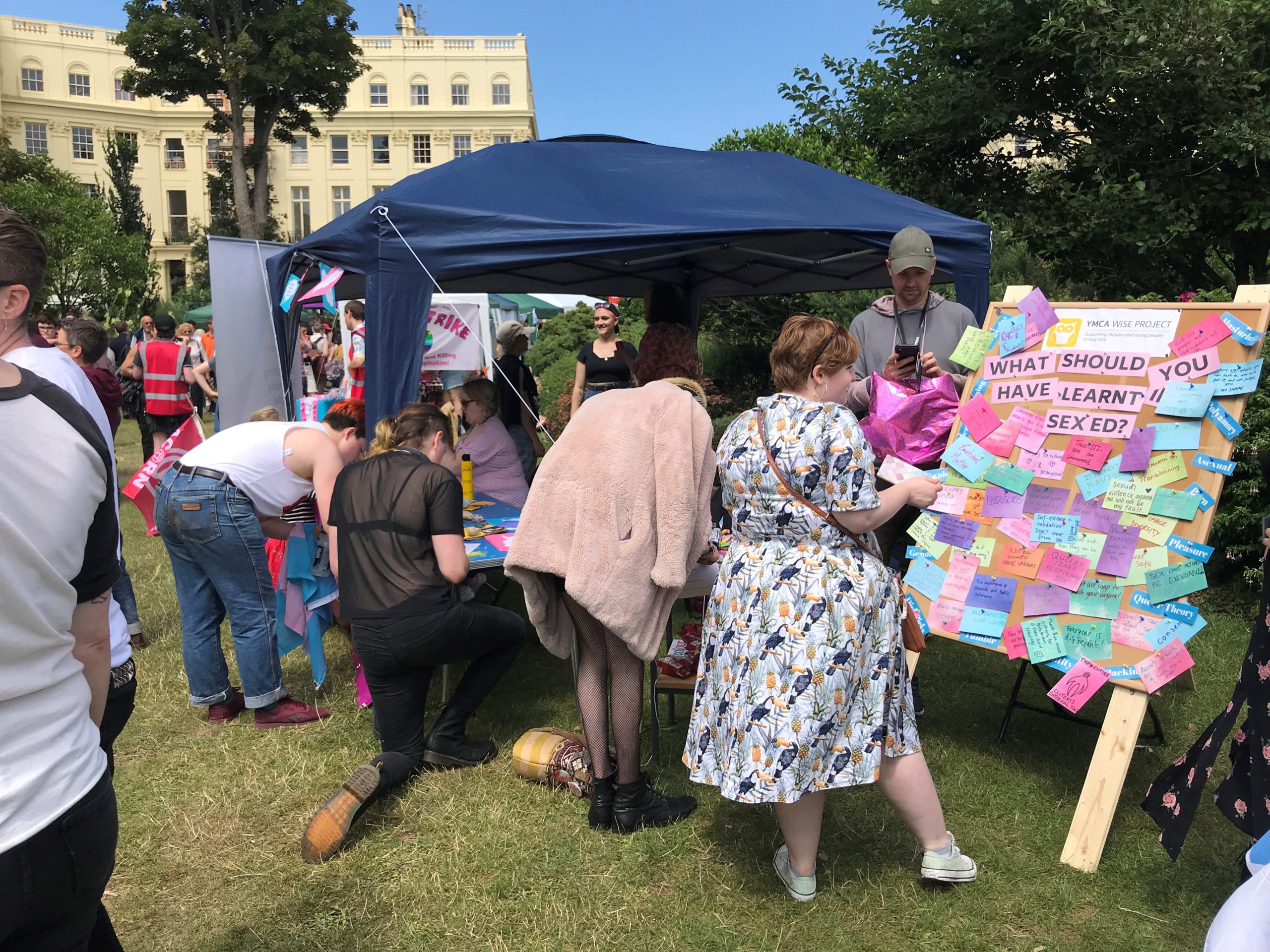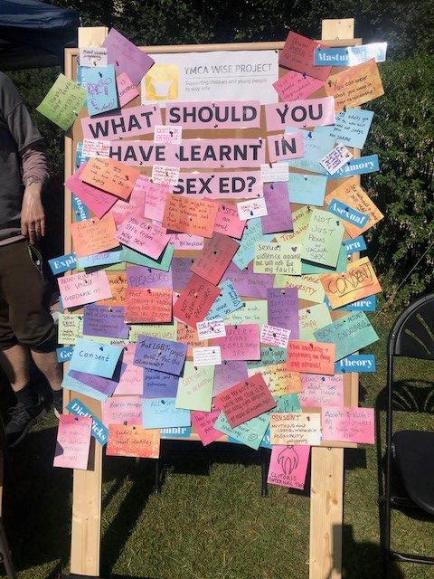 YMCA WiSE are looking to develop LGBTQ+ inclusive resources around healthy relationships, sex and consent. We were at Trans Pride asking the trans community what things they wish they had learnt at sex education at school. We were really impressed by how many amazing suggestions we got, covering issues such as different types of sexualities, relationships, pleasure and consent. We soon ran out of paper and space on our board!