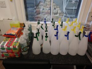 We’ve been asked by our manager to supply cleaning products to all properties, so we call round shops and suppliers, zero in stock again. But that’s not a problem as there is always a way. A brain wave from Daisy plus a load of empty bottles, a popular concentrated home cleaning product, a bunch of maths skills to work out the dilution and Hayley with the required COSSH (Control of Substances Hazardous to Health Regulations 2002 to ensure we are fully compliant) and we’ve solved it! Cleaning products supplied to all properties.